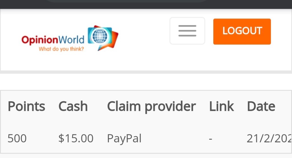 Introducing opinionworld… I signed up on the 18th and it takes 72 hours before cash out can be requested. I met the minimum 500 points for 15 dollars in about 2 days. One thing about this website though. They claimed the 15 dollars to be USD, however I received them in my paypal account as local currency.